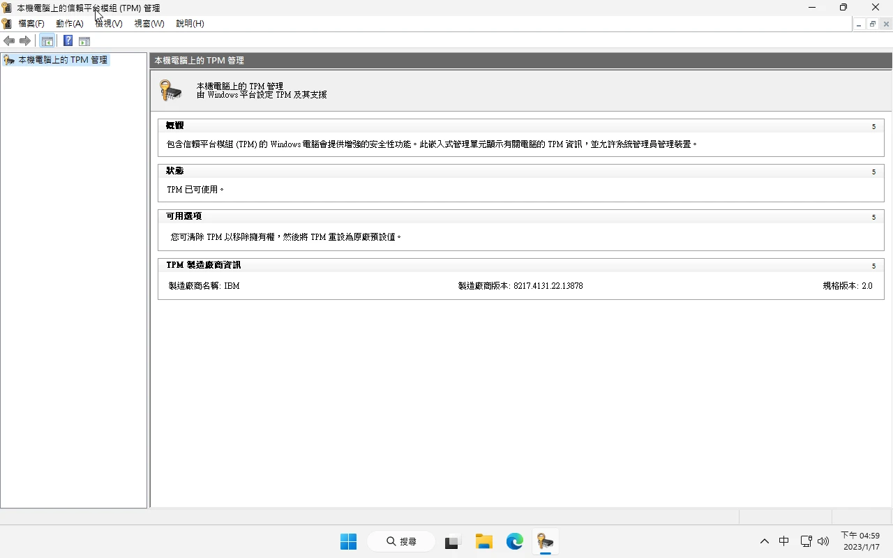 按Windows + R,啟動tmp.msc亦能見到TPM 2.0正常載入。