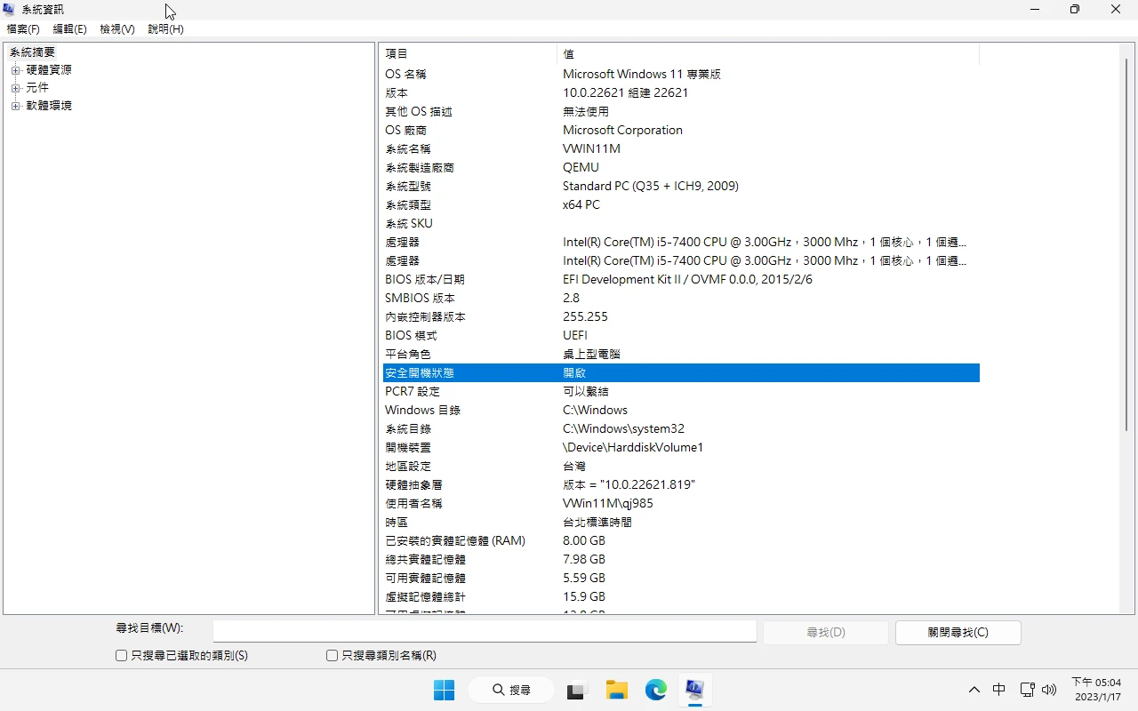 虛擬機開機後搜尋「系統資訊」,可以看到Secure Boot正常啟用。