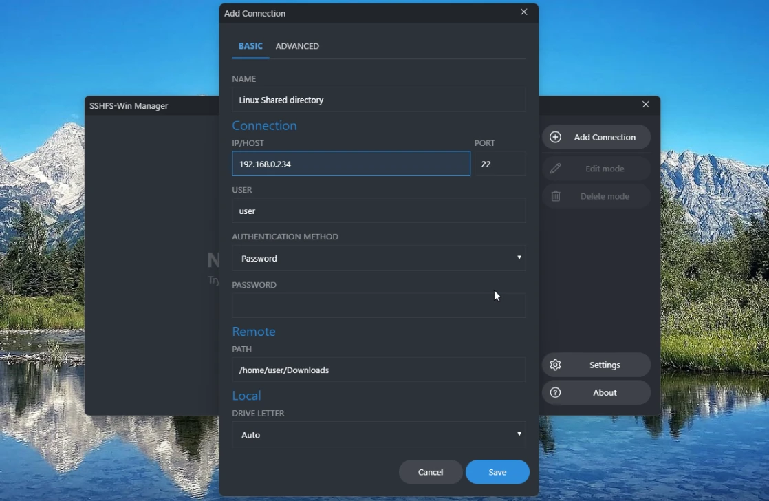 IP填入Linux OS的區域IP(區域IP可以用ip addr指令查看)。User填寫Linux Host的使用者名稱,Password填寫密碼,Remote PATH則是要掛載的目錄,例如Linux Host的Downloads