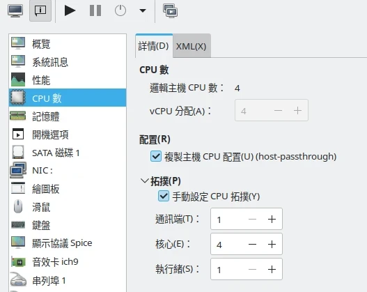 開啟Virt Manager → 編輯CPU,勾選複製主機CPU配置。再依情況手動設定CPU拓樸,例如我是1通訊端4核心1執行緒
