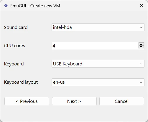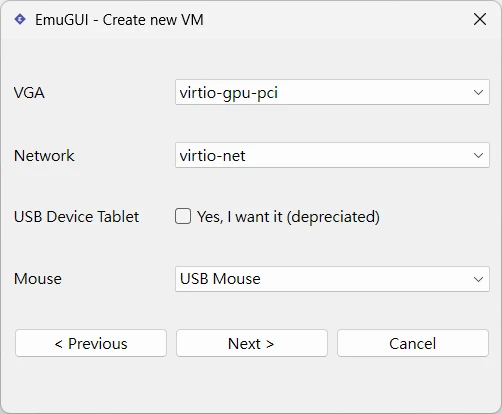 VGA要看QEMU版本決定,通常選std最保險,Network的話選e1000或virtio-net