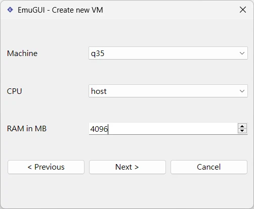 Machine選取q35,CPU選取Host(或者Skylake-Server),RAM最低給4096 MB