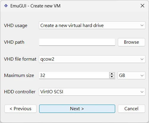 點選Create New VHD,並指定虛擬磁碟存放路徑,格式選qcow2,容量最低給16GB,最下面HDD Controler可留白