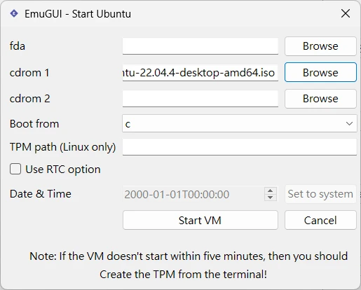選取列表的Ubuntu,點選Start Virtual Machine,再選取開機ISO,點選Start VM