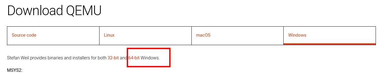 到QEMU官網下載Windows安裝檔,點選64-bit,再點選