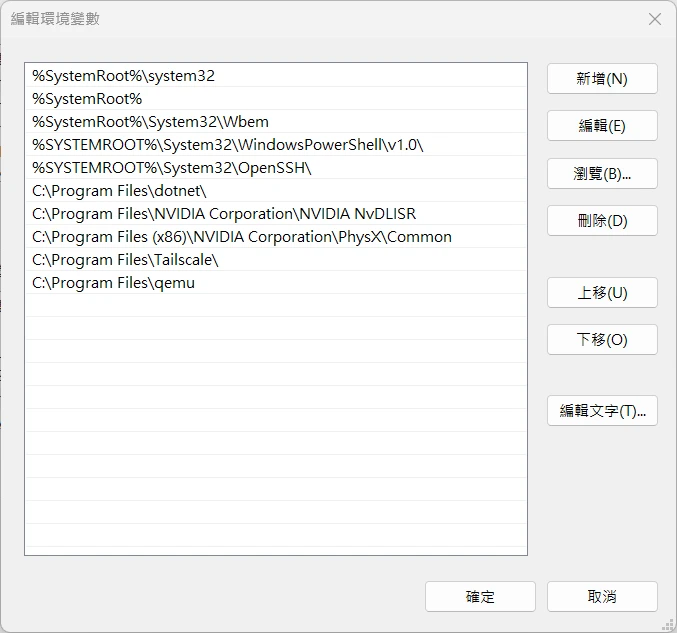 C:\Program Files\qemu搜尋「編輯系統環境變數」,點選環境變數 → 系統變數,點選Path,將qemu加入環境變數