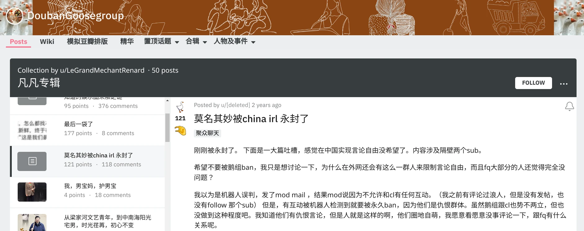 豆瓣鵝組r/DoubanGooseGroup也考慮過ban掉讓浪人的作法,沒想到卻也被r/China_irl的亂ban人機制整到了。