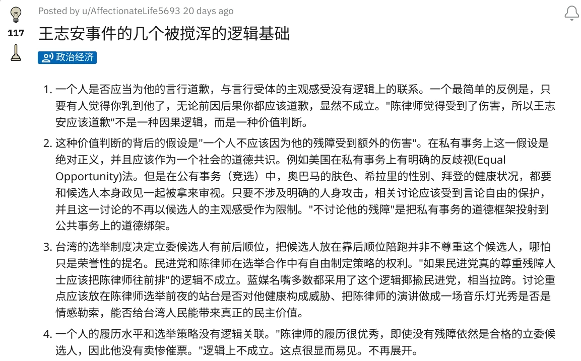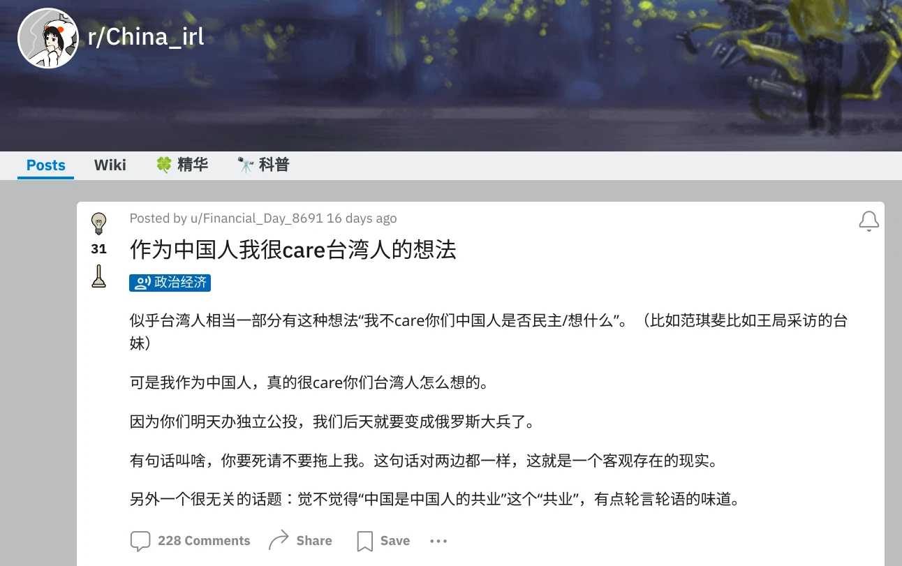 我是在「王志安失言遭民進黨政治封殺」事件後,才真正擁抱r/China_irl用戶的,在那之前都是潛水。我目擊到各大中文社區對此事有截然不同的看法,其中r/China_irl是相對理智(理智不代表正確)的一方,所以在關注r/real_China_irl的同時,又到r/China看看這裡人的說法。