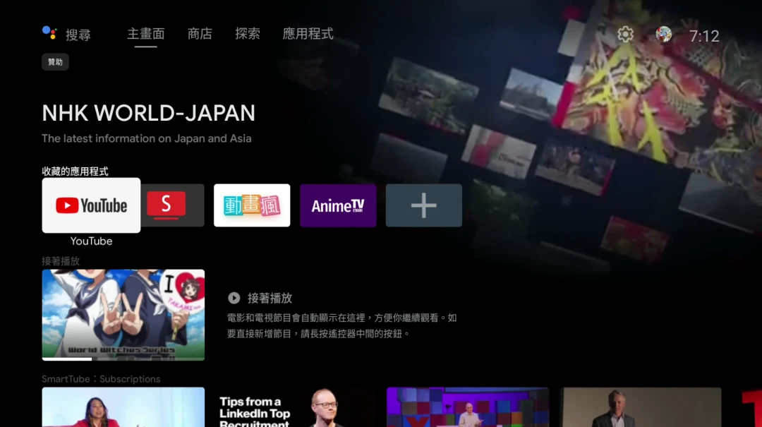如果APP支援的話,Android TV能夠在首頁顯示最近播放的影片。