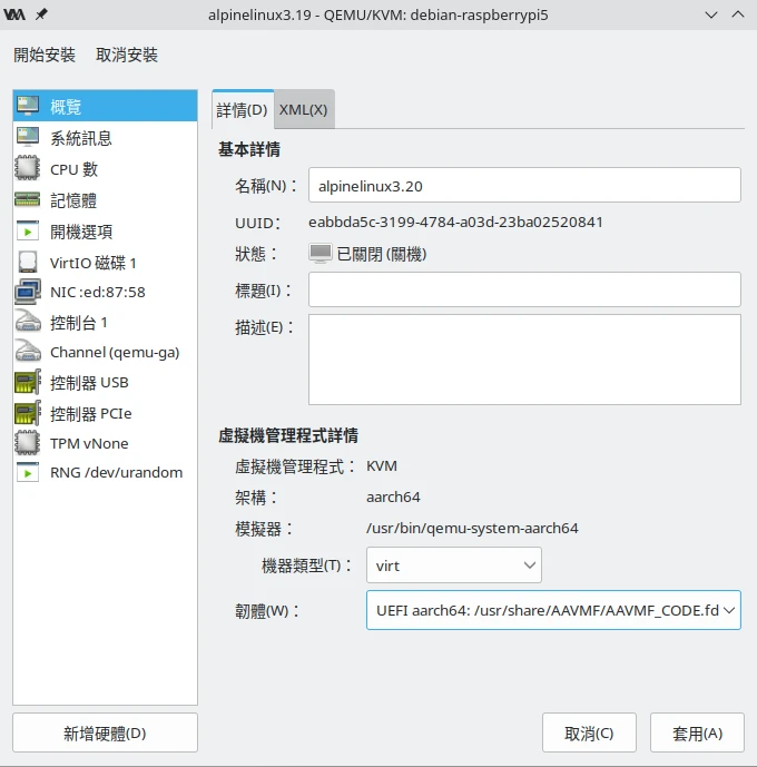 不知為何,Cockpit嘗試啟動虛擬機沒多久後,Raspberry Pi系統就會整個當掉無回應,可能是bug?所以我用Virt Manager新增虛擬機。