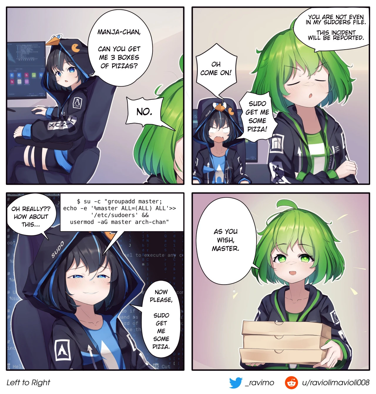 Arch醬用sudo權限命令Manjaro醬的趣味漫畫,順便教你快速加入sudoer的指令。從這張的情報來看,Ramivo應該也有設計過Manjaro娘的形象,不過一直沒公開。