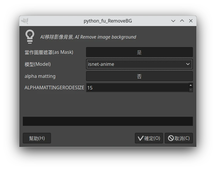 之後RemoveBG的選單就會出現在GIMP的濾鏡 → Python-fu