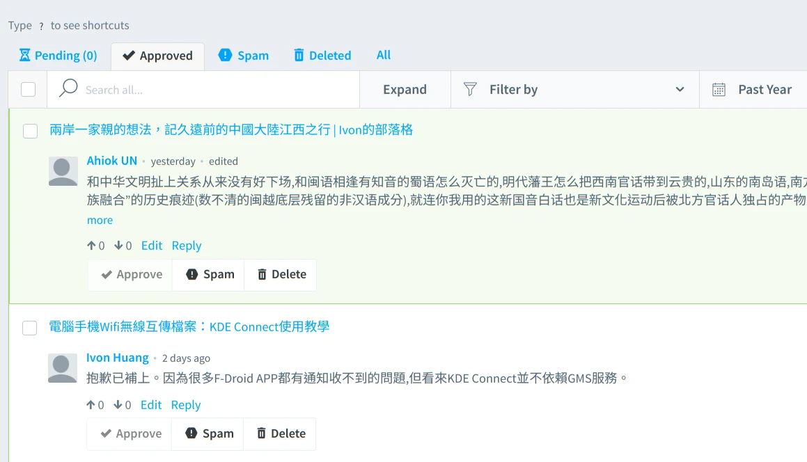 現在Disqus有後台核准才能顯示留言的功能,其實就可以防止洗板了。一言堂形成!我可以亂刪批評的留言了(好獨裁)老實說,我不會看不爽留言就刪除,除非是洗板或者直球辱罵。