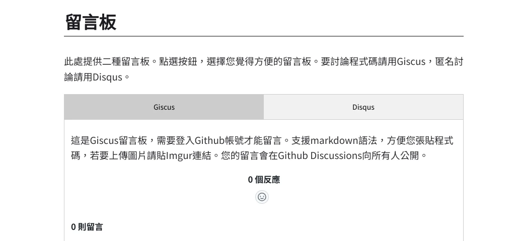 過去有Gitalk、Utterances,透過Github issues當留言板,後來有了互動能力更強的Giscus出現。