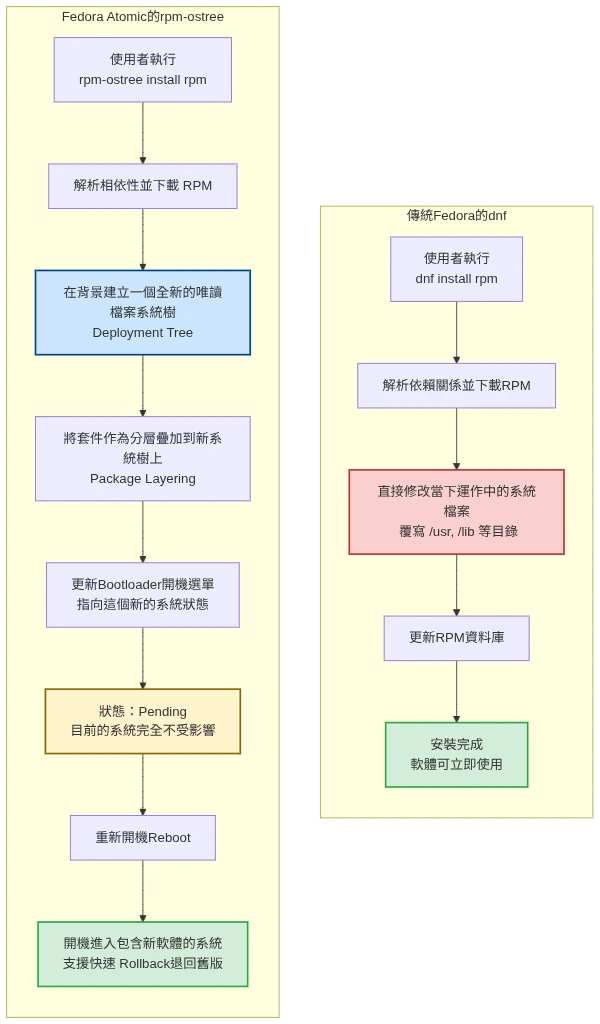 基於我粗淺的理解,rpm-ostree vs dnf,兩者的差別可以用以下簡圖表示: