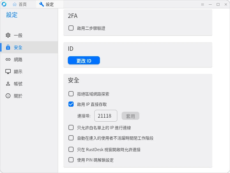 註:RustDesk在P2P連線的時候無法使用點對點加密,不過Tailscale連線本身就有加密了所以不用太擔心。