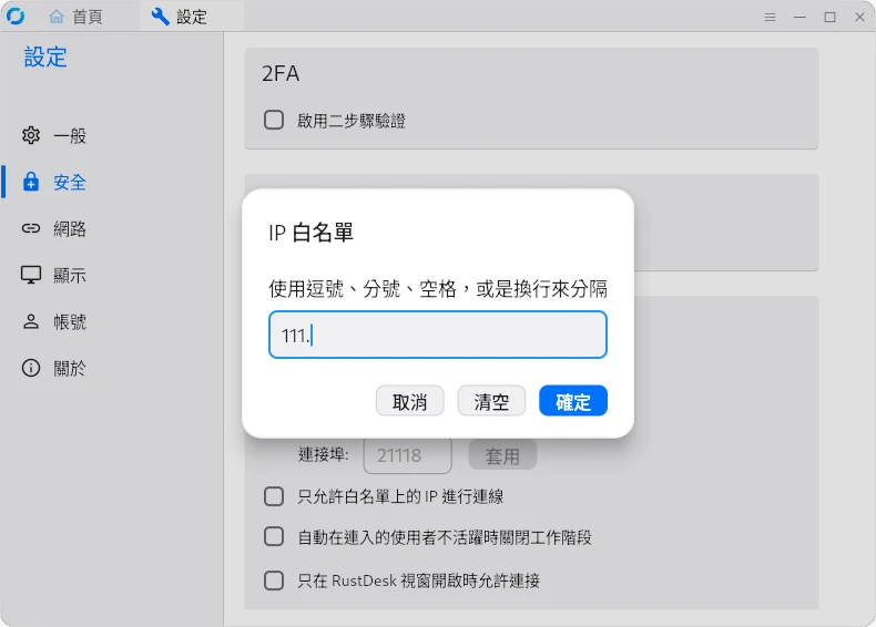 (選擇性)增強RustDesk 安全性,開啟白名單模式,允許只有Tailscale IP的裝置才能夠連線進來。