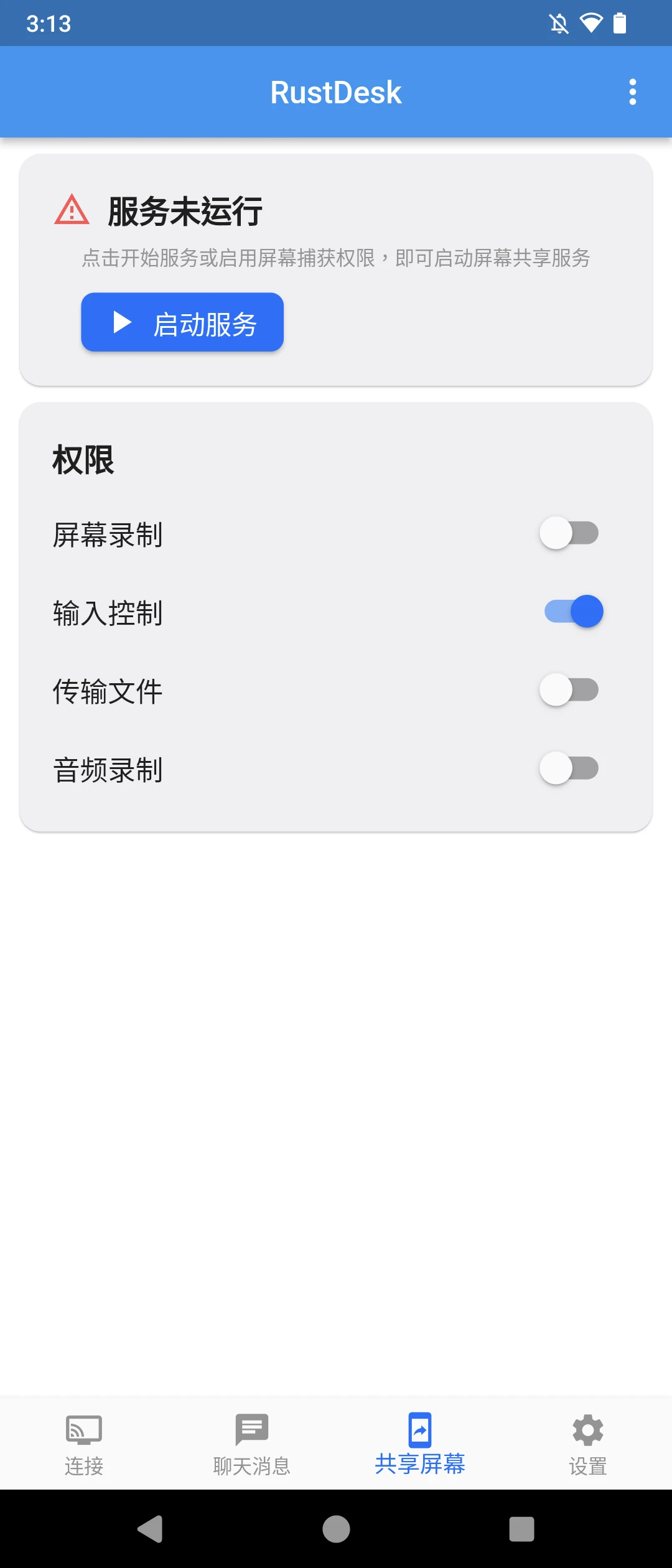 註:Android13以上系統需要在多工頁面點選RustDesk圖示,到關於APP頁面,點選右上角三個點「解除限制」才可以開RustDesk的無障礙功能。