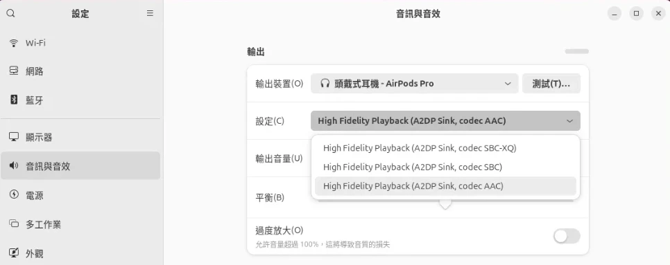 pactl info指令查看目前的音訊系統是否為PipeWire。在桌面環境的音訊設定,選取藍牙裝置的編碼器為SBC-XQ