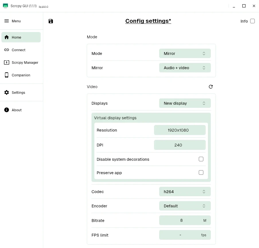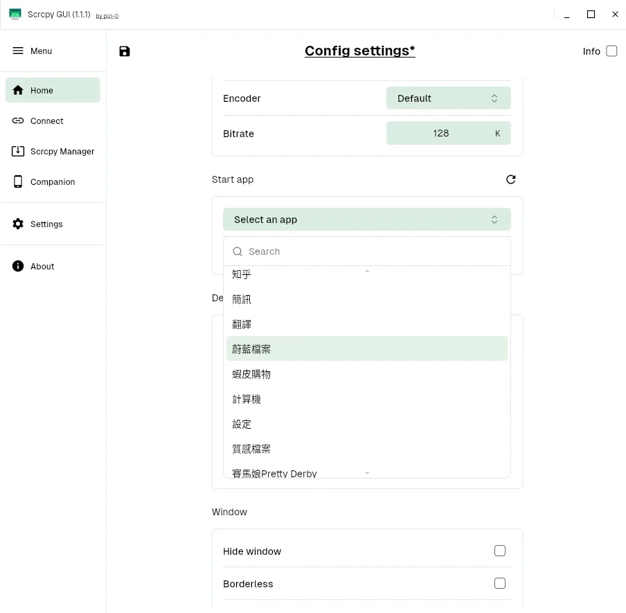 pizi-0開發的圖形界面Scrcpy GUI提供快捷設定檔的功能,裡面有各個指令的說明,這樣就能把虛擬顯示器的指令做成按鈕一鍵啟動了,減少打指令的麻煩。