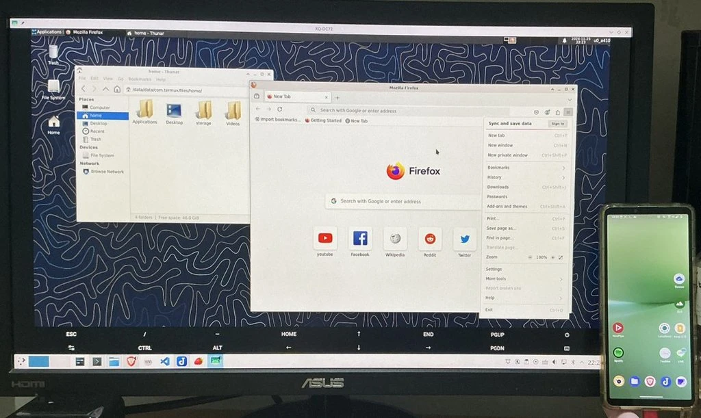 啊你說我都在用電腦了我何必這樣做跑電腦軟體…也許,你用的是限制更多的ChromeOS呢?或者,你想要在非Samsung手機複製Samsung Dex的功能呢?Termux跑的Linux桌面環境,視窗管理比Android好。