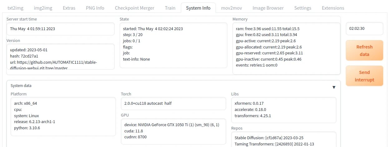 此擴充功能給Stable Diffusion WebUI新增一個監控系統資訊的頁面,顯示主程式版本、系統資訊、GPU、RAM、使用的模型、使用的命令列引數等等。
