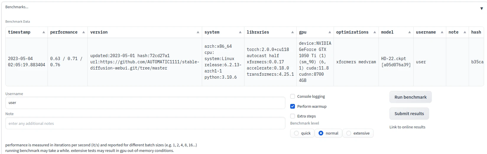 點選下面的Run benchmark可以跑分測試系統性能,有助於評估主程式更新後性能是否有變化。點選Submit results將結果回報到Vladimir Mandic的網站。