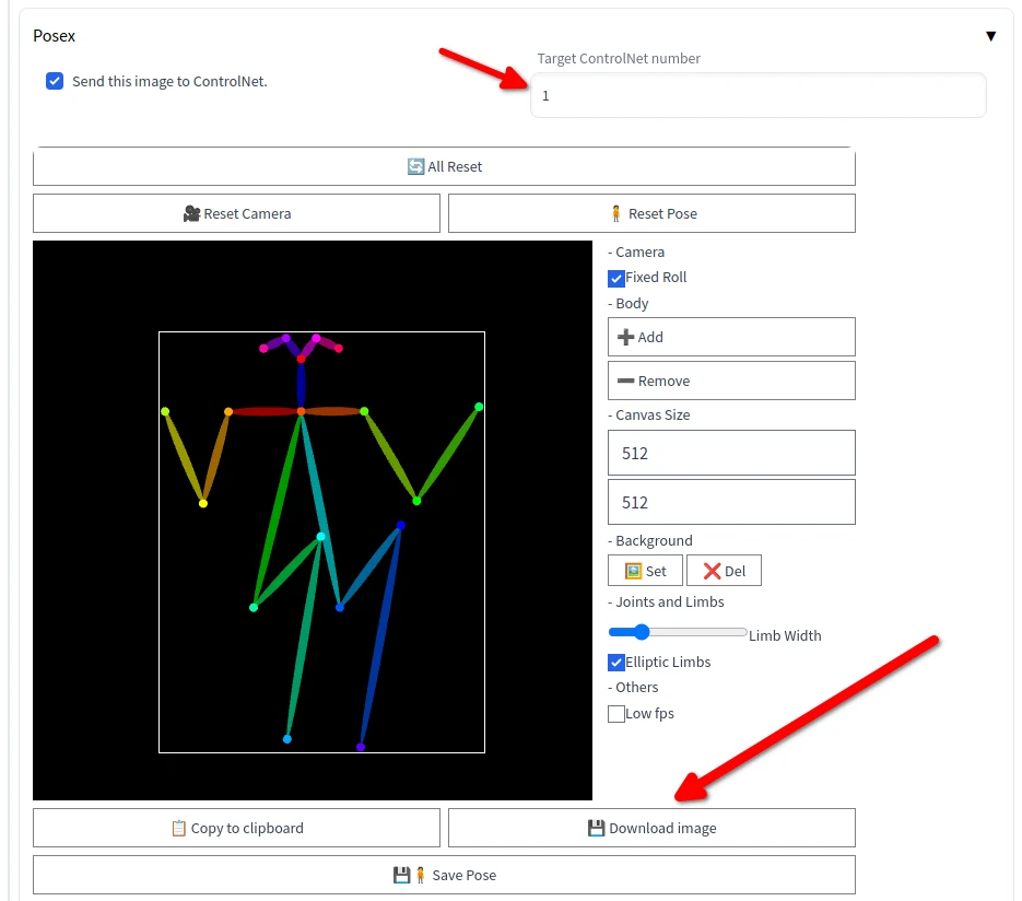 Target ControlNet number為1,擺好骨架,並設定。然後點選Save PNG,得到一張png圖檔
