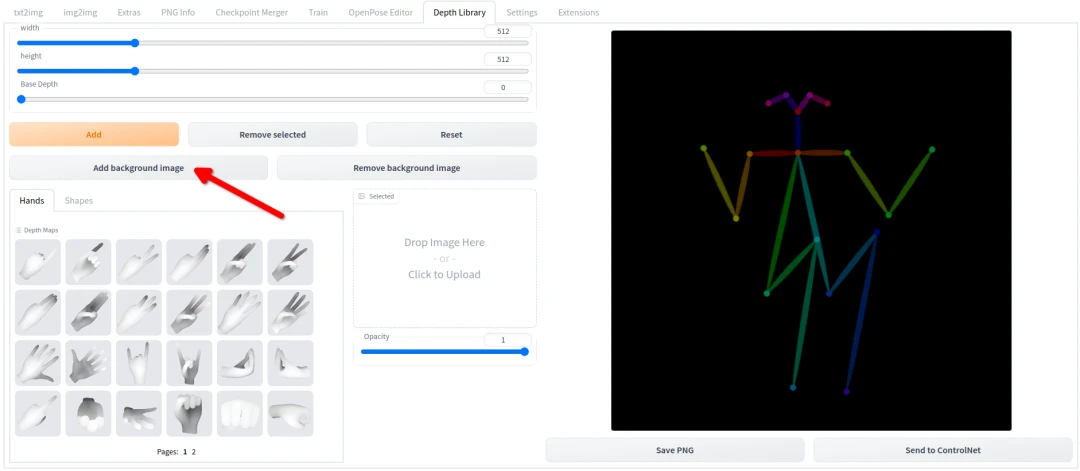 切換至Depth map library頁面,點選Add Background Image,上傳PoseX骨架的圖檔。