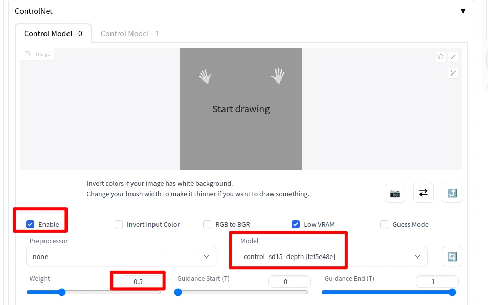 回到文生圖頁面,點開ControlNet,將0號ControlNet的preprocessor和model設定為Depth,Weights設定為0.5。