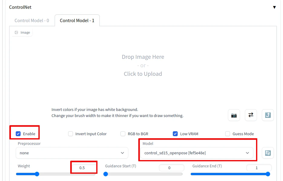 再點選1號ControlNet,將model設定為OpenPose,Weights設定為0.5。