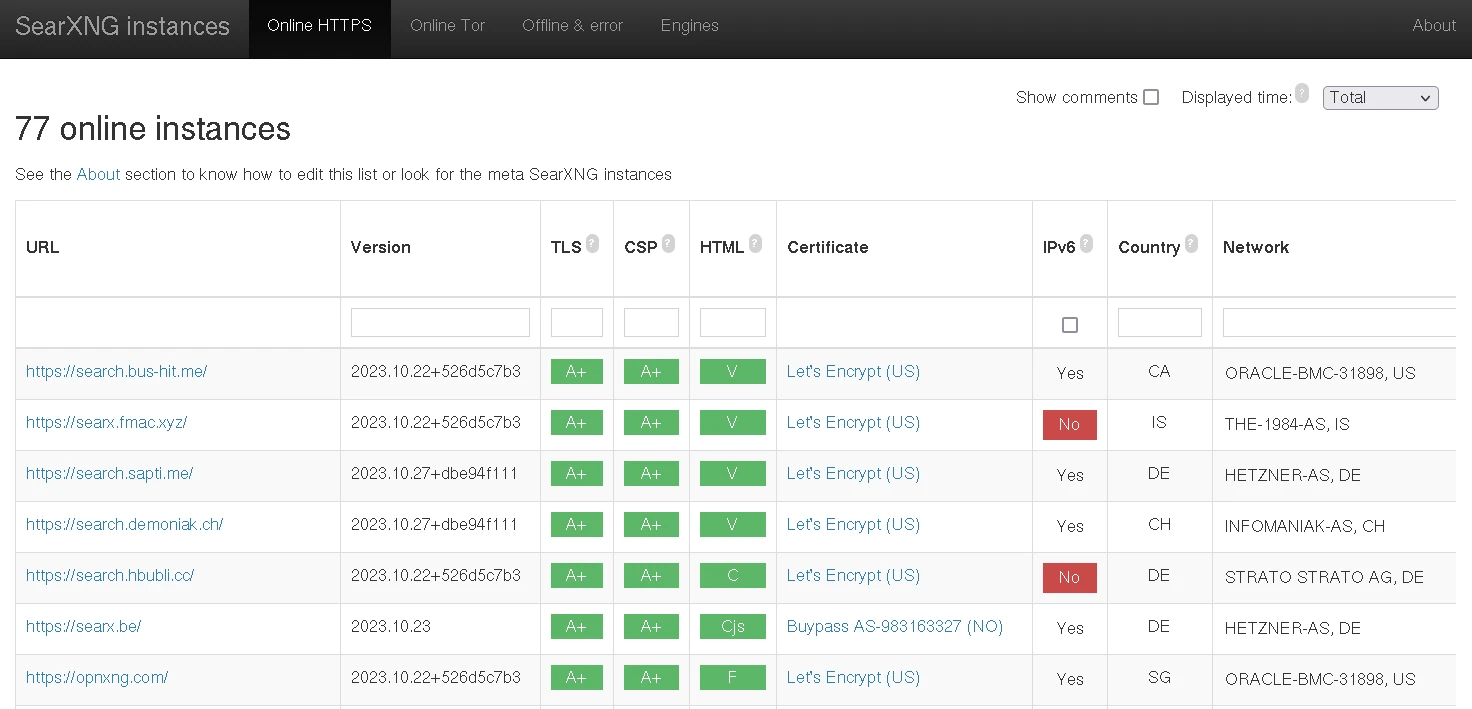 SearXNG官網有世界各國提供的公共站台(public instances)供挑選,請直接從裡面挑一個回應速度快的網址使用,可信度自行判斷。