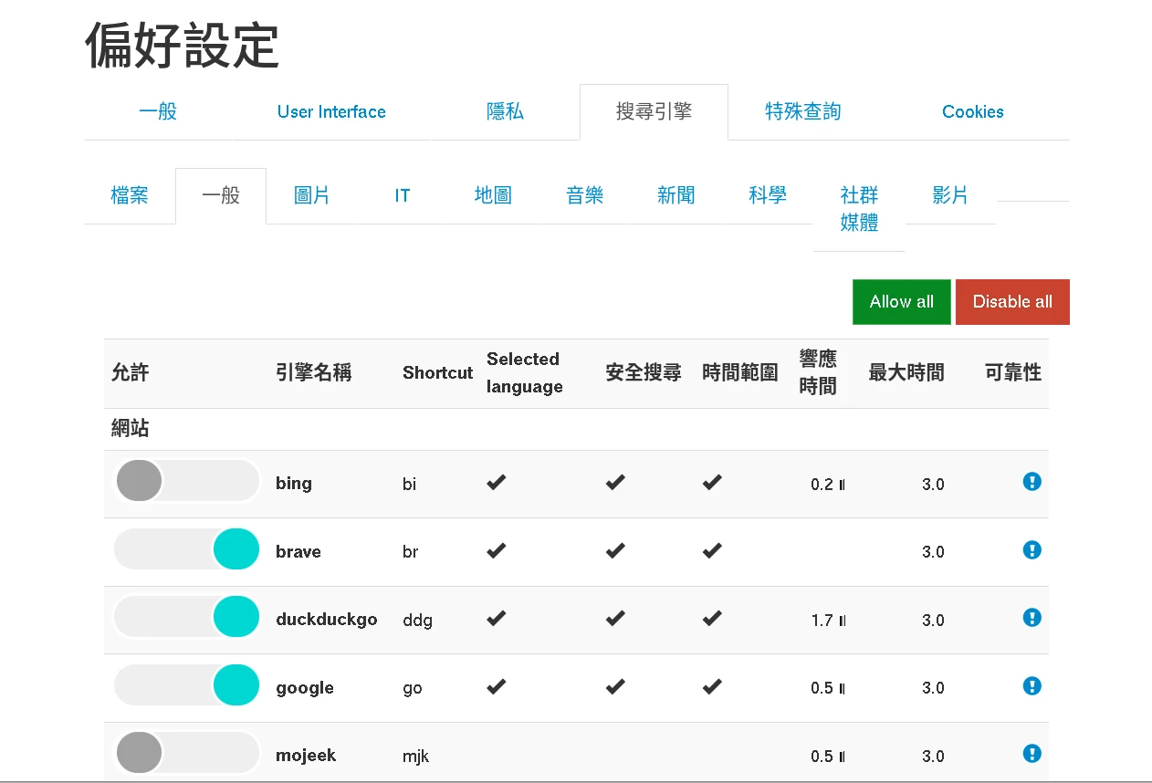 在開始搜尋前,到SearXNG站台右上角點選「偏好設定」,選擇要納入搜尋結果的搜尋引擎。若像我這樣選擇太多搜尋引擎,除搜尋處理時間會變長外,有些主機甚至會拒絕連線。