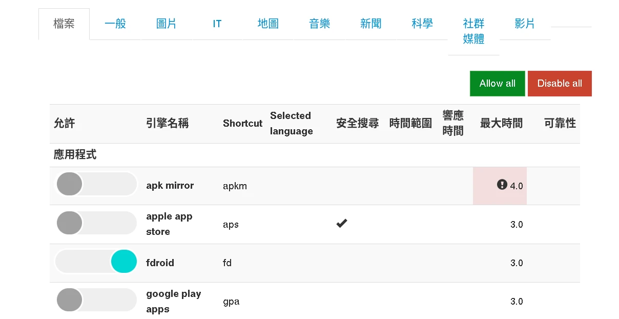 缺點的話,搜尋速度取決於SearXNG站台的回應速度。通常Google在2秒內就會載入結果,而國外SearXNG站台回傳至少要2秒以上。而且不像Google這種大企業能24小時在線上,您使用的站台可能會不定時下線,導致服務中斷。
