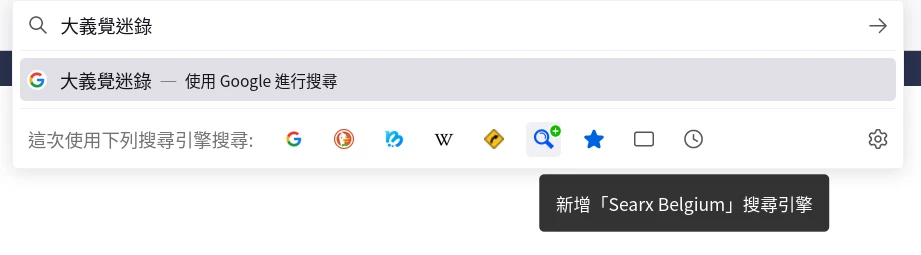 在前往SearXNG站台後,Firefox網址列應會出現新增「SearXNG」,點一次它就會跑到您的搜尋引擎列表了。
