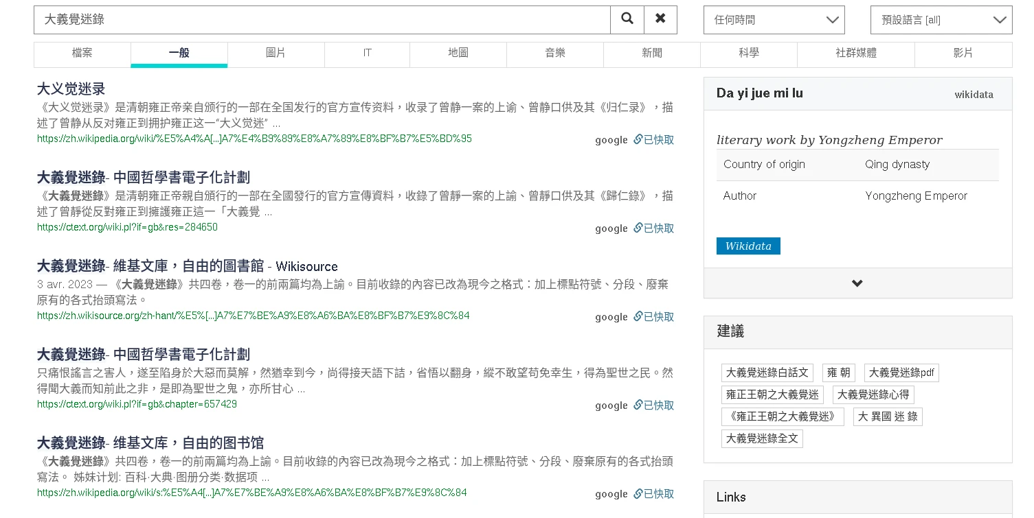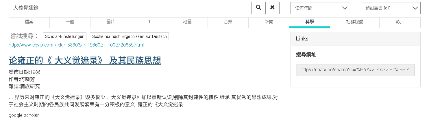 下面以搜尋清朝雍正寫的《大義覺迷錄》這本書為基礎,比較Google搜尋和SearXNG搜尋的結果。SearXNG這邊啟用的有Google、Duckduckgo、Brave。