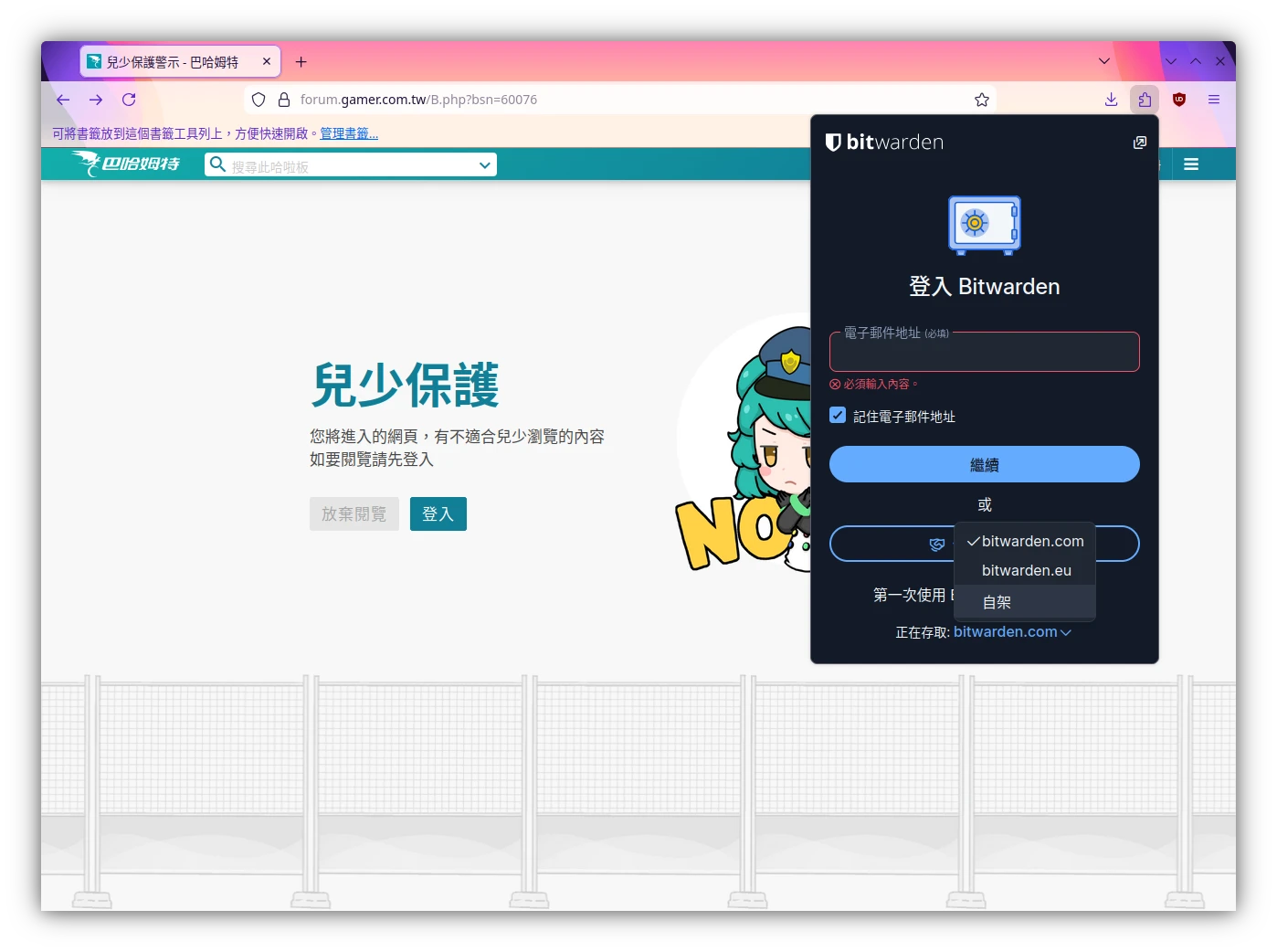 以瀏覽器擴充功能為例,在登入面板,將網域切換到自架伺服器,輸入自己的域名,然後登入。