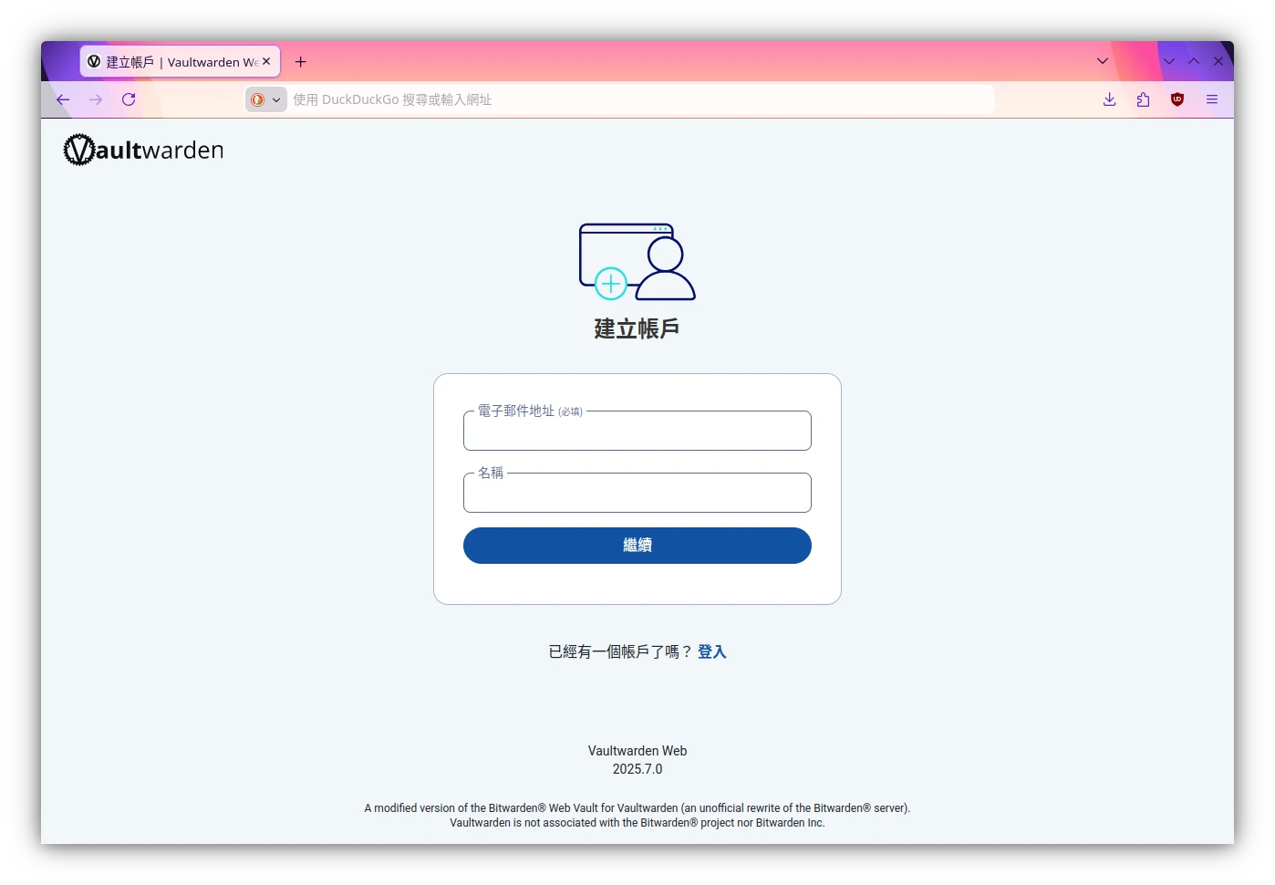 註解:你不需要註冊Bitwarden官方伺服器的帳號也可以用Vaultwarden。
