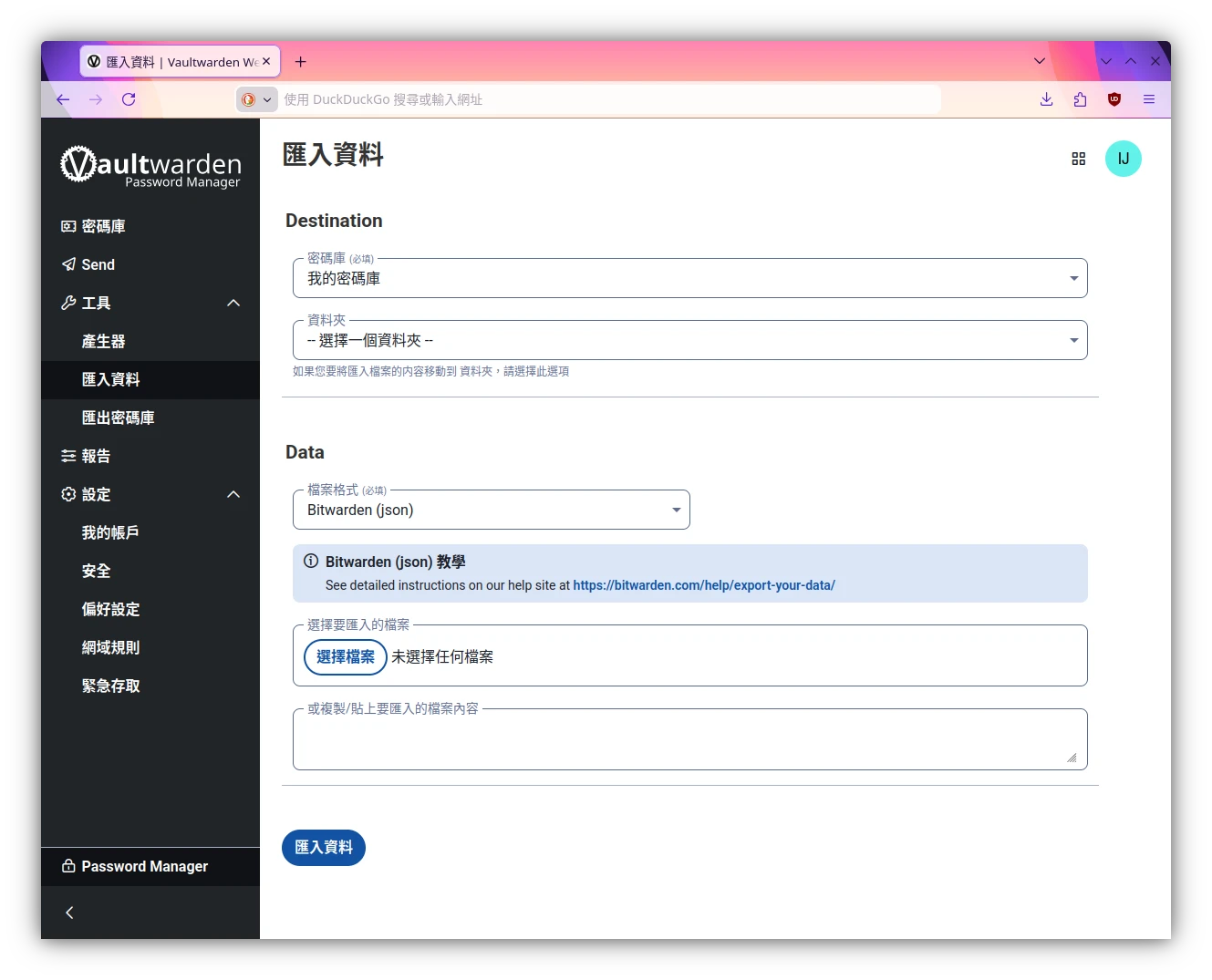 然後在Valutwarden的工具 → 匯入,格式應當是完全相容的。
