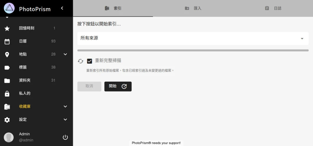 - 再啟動容器。登入PhotoPrism網頁,開始掃描新相片。