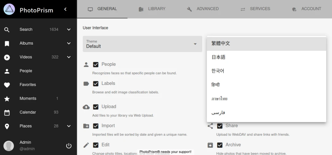 不過,PhotoPrism有些進階功能是隱藏的,要付費成為贊助者他們才會開放給您使用。