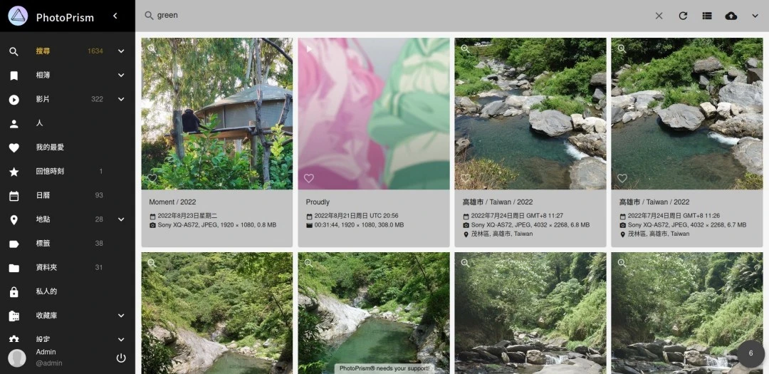 PhotoPrism主介面是相片影片總覽,按照圖片拍攝時間排序。可用搜尋語法過濾圖片。