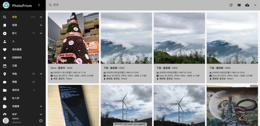 PhotoPrism是開源免費的相簿服務軟體,介面跟Google相簿類似,用於瀏覽電腦上的相片影片。在搜尋時會使用臉孔偵測、AI辨識、地點給圖片分類和上標籤,就像Google相簿自動整理的功能。
