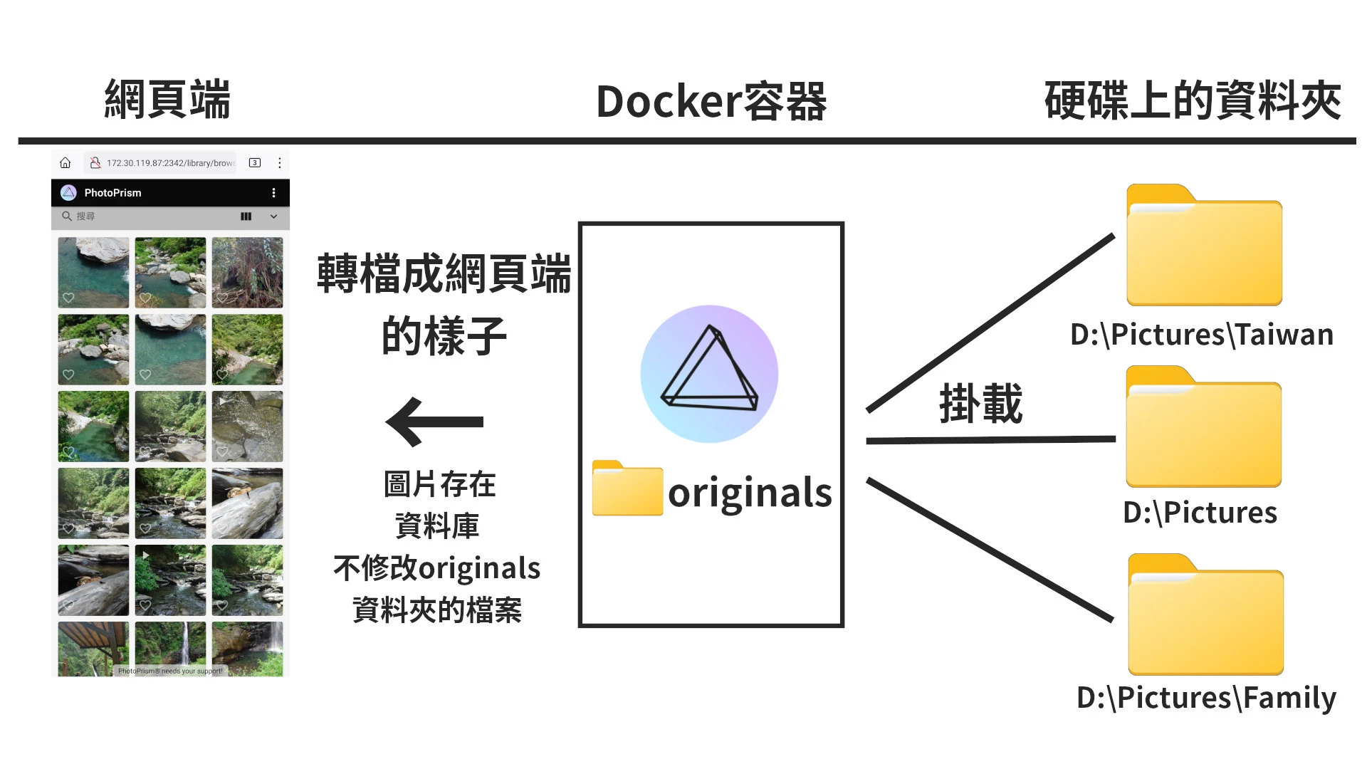 originals,但在Docker容器內部不好存取。硬碟有個目錄叫做Pictures,你將它掛載到PhotoPrism,PhotoPrism就會將Pictures當作originals目錄使用。