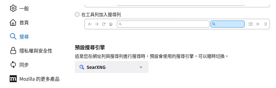 最後在Firefox的搜尋引擎設定找到SearXNG,將其設定為預設搜尋引擎。