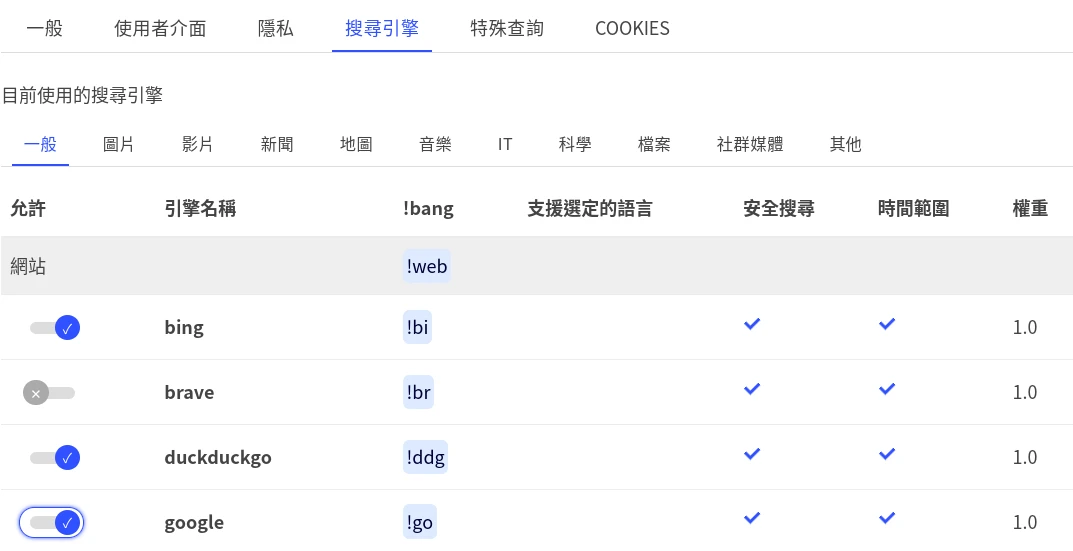 進入SearXNG首頁後,點選右上角設定做些微調。