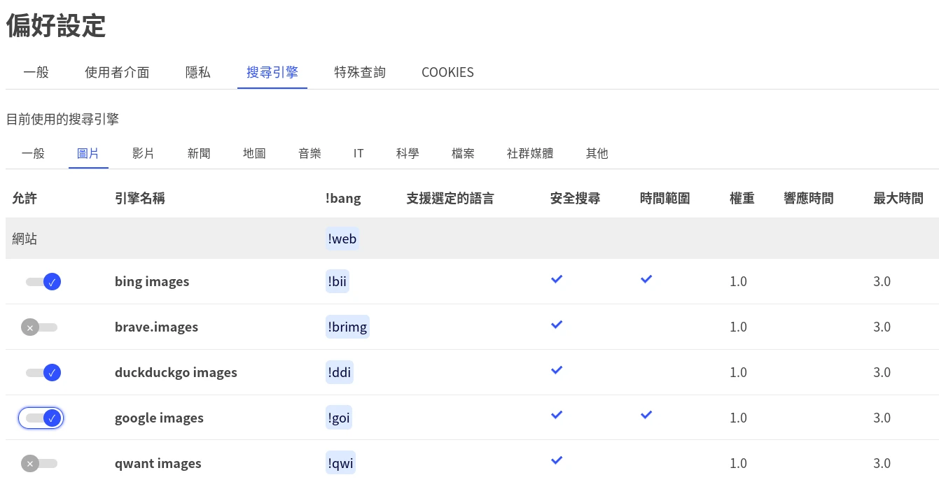 首先搜尋引擎並非越多越好,會增加回應時間。通常我只會保留Google、Duckduckgo、Bing這幾個較多人用的。再來QWant要取消勾選,因為QWant只有在歐洲提供服務,台灣無法使用。