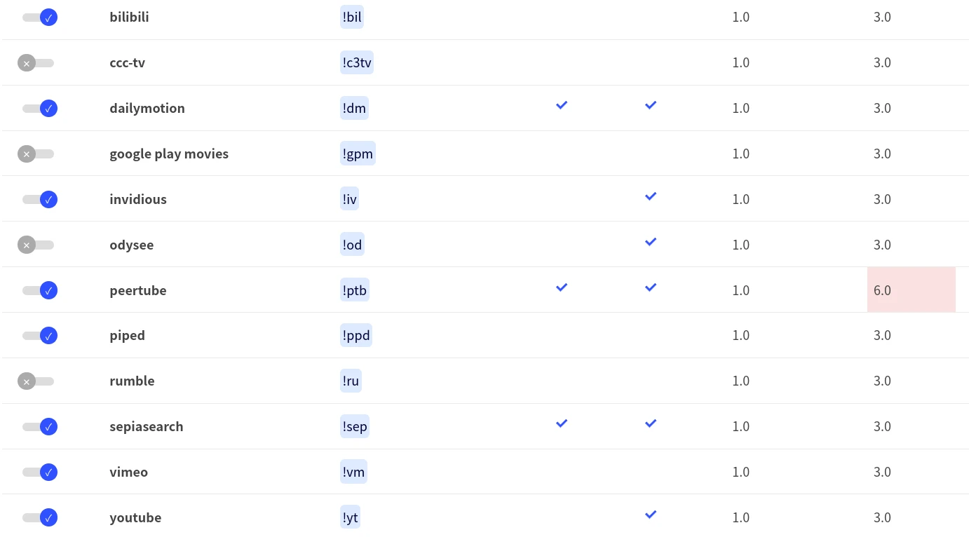 影片的話可把Youtube改為搜尋Invidious結果,並啟用Sepia Search(PeerTube)看到更多影片。