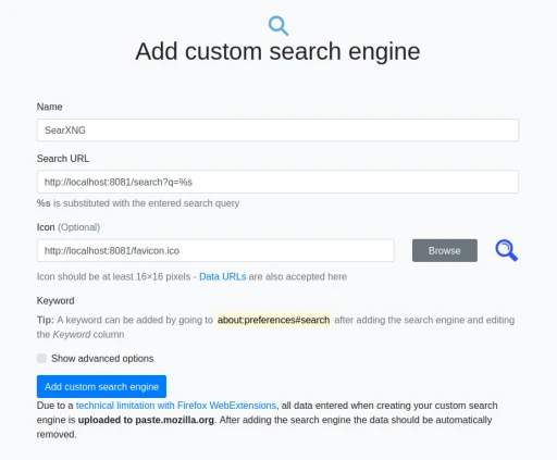 開啟Add custom search engine,如圖填寫。電腦端因為是在本機,所以網址是localhost:8081。