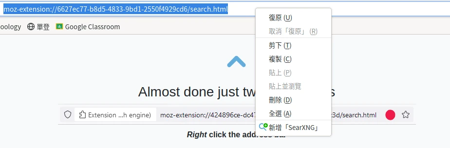 接著我們要把瀏覽器網址列的預設搜尋引擎設定為SearXNG。